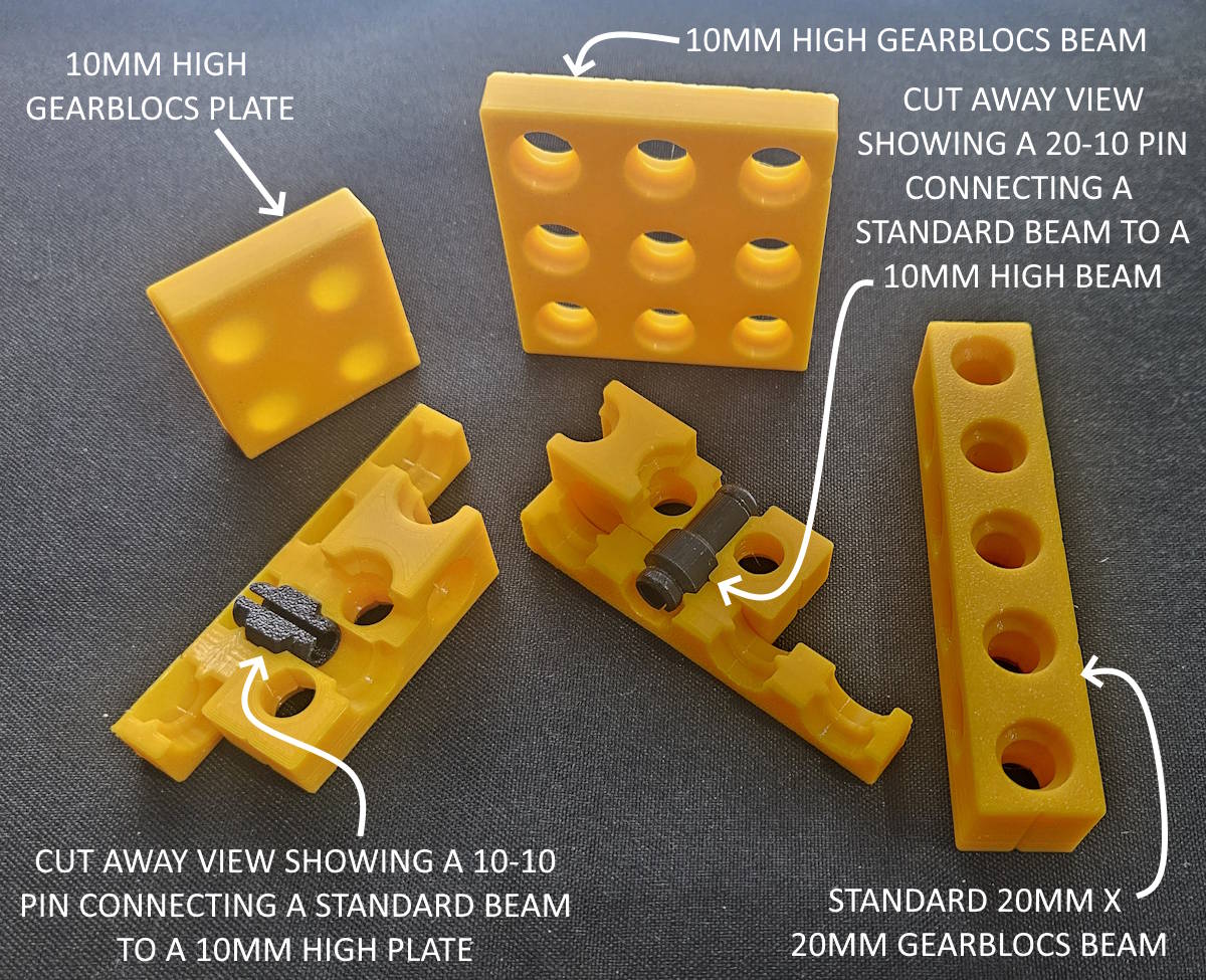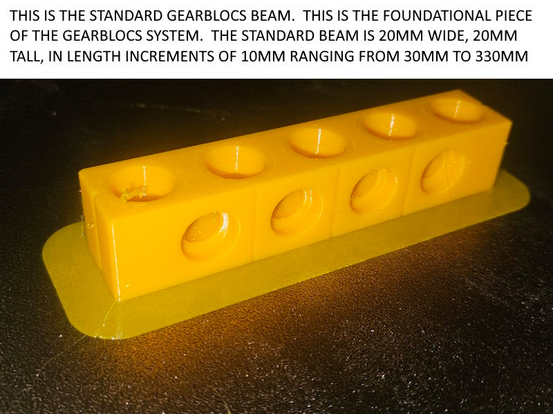 The entire GEARBLOC system is built around the GEARBLOCS beam, which is a 20mm x 20mm x variable length plastic beam that can accept a 12mm O.D. bearings and which can be connected both vertically and horizontally to other beams, as well as plates and various other types of parts. GEARBLOCS beams are designed for maximum flexibility in building. The system also comes with gears, shafts, sprockets, chains, wheels, etc and various other 3D printable parts to allow for building functional machines and RC powered land toys.