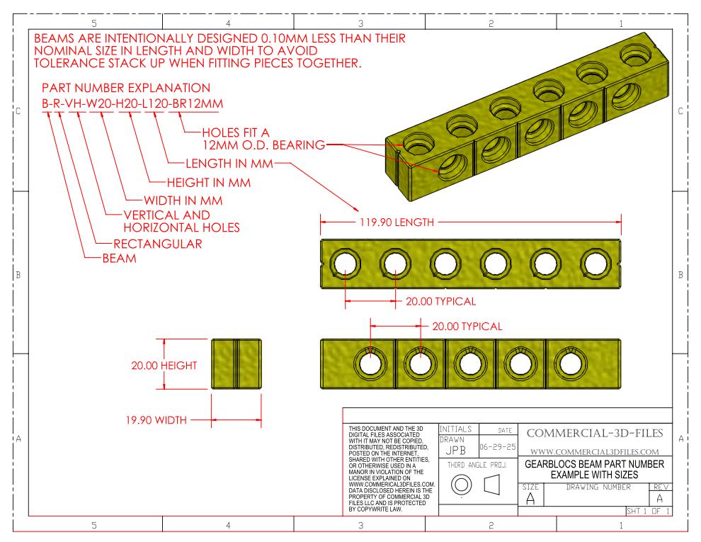 The standard GEARBLOC beam is 20mm tall and 20mm wide, with lengths available in 10mm increments. The image below shows an example drawing of the standard GEARBLOC beam with an explanation of the part number and what the various numbers and letters mean in the part number. GEARBLOC beams also come in 10mm heights, and the GEARBLOC plates are 10mm high with a smooth side and a side that has connector holes.