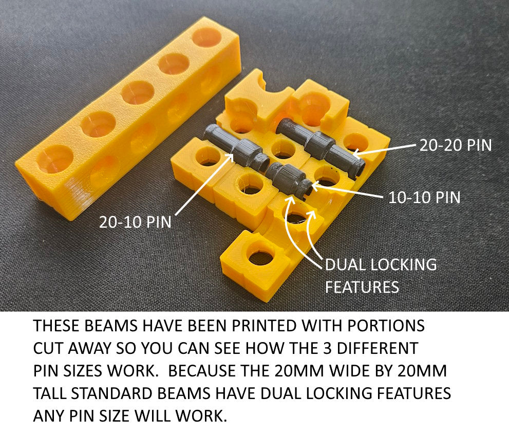 In the image below, parts of the standard beam have been cut away so you can see how the pins work inside the holes. Because the standard size beam has dual locking features in every hole, any size pin can be used to connect these. Using a pin with a 10mm end causes the pin to only pass half way through the 20mm beam, which allows you to have another 10mm pin in the same hole on the other side. This increases the options for how to build your assemblies. See below for an example.