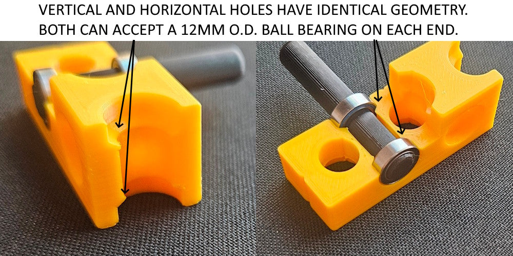 Both the horizontal and vertical holes in GEARBLOC beams have identical geometry. Either can accept a 12mm O.D. x 8mm I.D. ball bearing in either end of the hole, allowing for higher speed operation of RC designs with shafts, gears, sprockets, and wheels, etc.