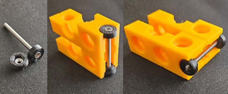 The GEARBLOCS system has a provision for locking beams together with metal fasteners. A washer can be 3d printed that accepts an M3 flat head cap screw, and another washer that accepts an M3 hex nut which can be normal hex or a nylok hex nut. The image below shows an example of how this works with a 40mm long screw. By using even longer screws like 60mm and 80mm you can lock 3 and 4 beams together for a very secure hold in assemblies that will be subjected to substantial forces.